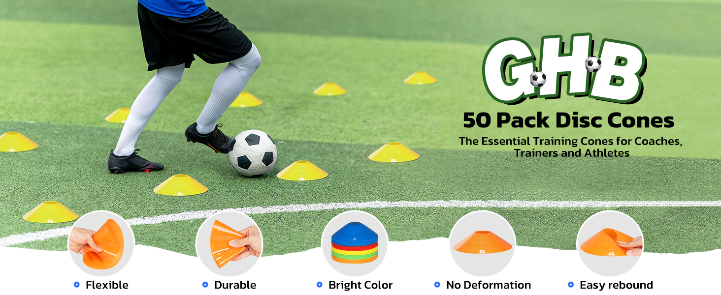 GHB 圆盘锥体 50 件装足球锥体运动锥体训练,带足球、篮球、教练、练习设备的手提袋和支架,包括锥形钻头指南