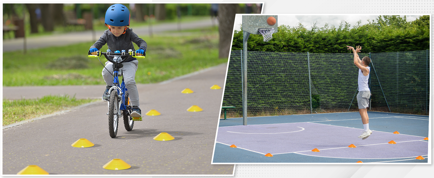• 多功能性:这些运动锥非常适合足球、橄榄球、篮球或垒球训练;它们可用于摩托车的障碍赛;它们也可以用于许多野外日比赛。