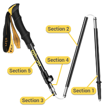 登山杖共 5 节,第 3 节和第 4 节为隐藏式设计,请用力拉出。